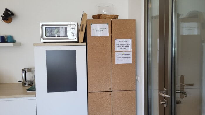Der Nachhaltigkeitsschrank befindet sich gleich beim Reinkommen auf der rechten Seite. Du erkennst ihn an den Korktüren und dem Schild „Nachhaltigkeitsschrank“.